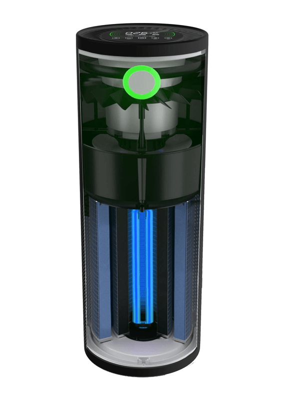 Hierdoor worden de zwaardere deeltjes die zich laag in de ruimte bevinden, vanaf de onderzijde het systeem ingezogen. De gereinigde lucht wordt vervolgens via de bovenzijde weer uitgeblazen, waardoor een constante circulatie ontstaat van zuivere lucht.