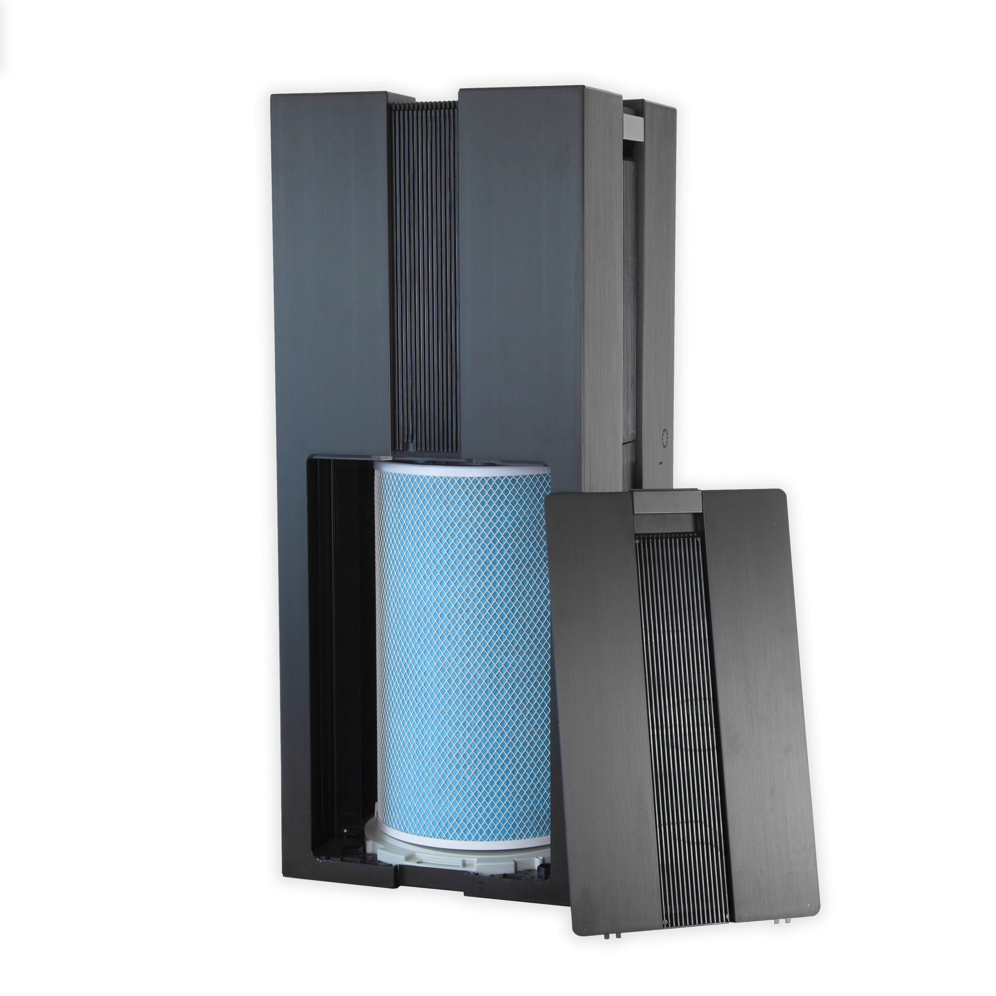 Hierdoor worden de zwaardere deeltjes die zich laag in de ruimte bevinden, vanaf de onderzijde het systeem ingezogen. De gereinigde lucht wordt vervolgens via de bovenzijde weer uitgeblazen, waardoor een constante circulatie ontstaat van zuivere lucht.